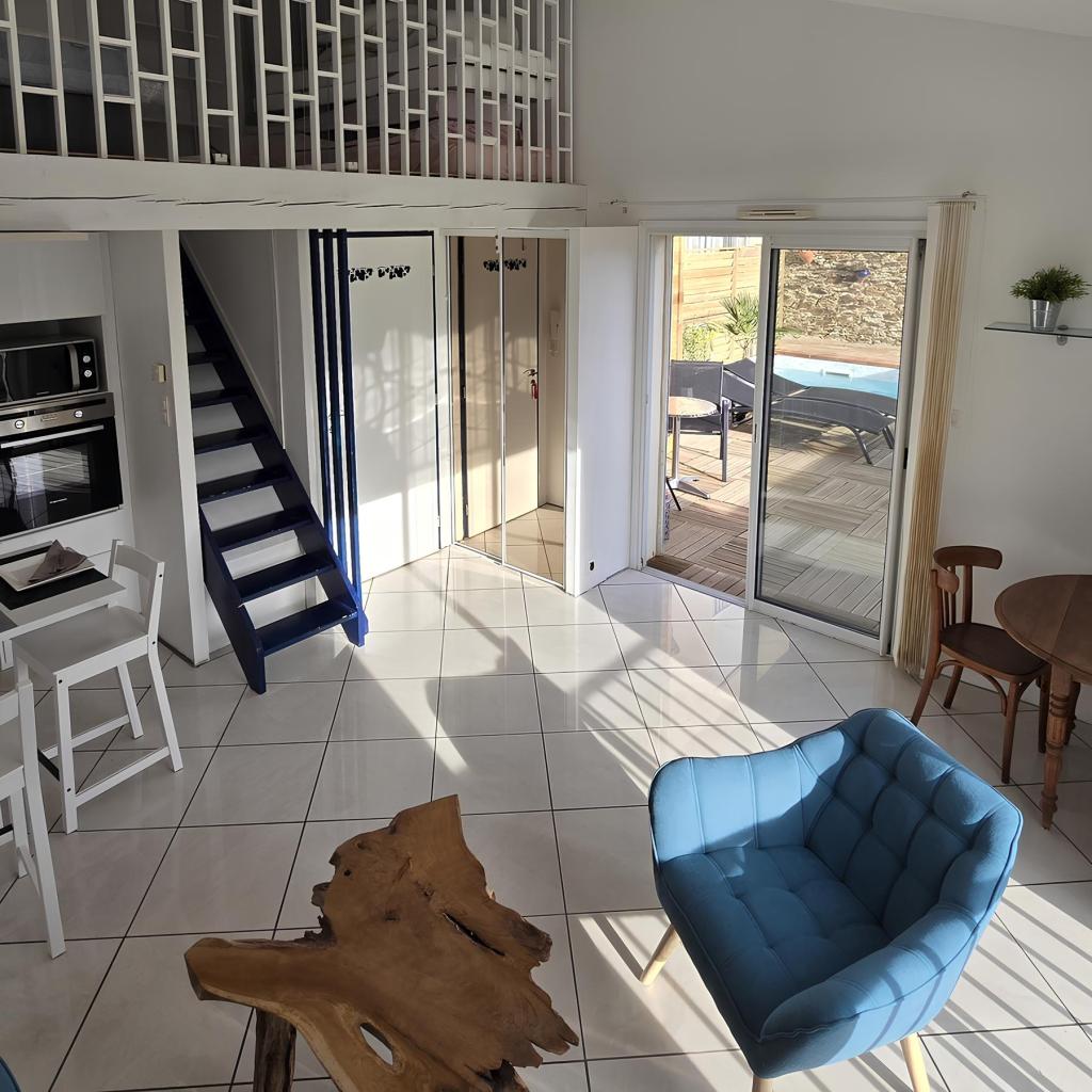 Notre gîte indépendant climatisé avec salon lumineux, cuisine équipée, salle d’eau et chambre en mezzanine avec lit Queensize de 160x200cm, vous offre confort et intimité.